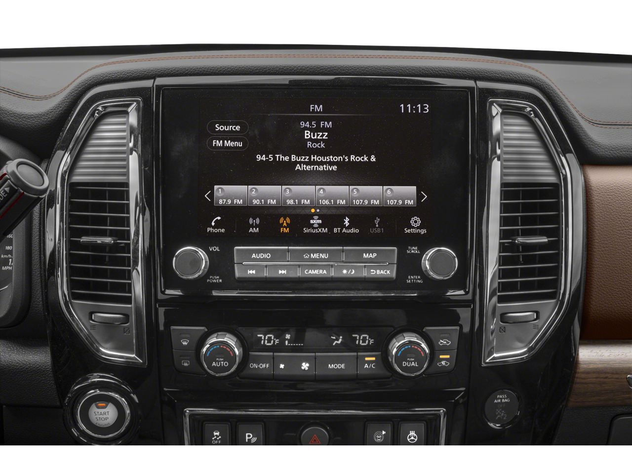 • Radio: NissanConnect w/Navigation -inc: 9" touchscreen display, 12 speaker Fender premium audio system, wireless Apple CarPlay, Android Auto, SiriusXM radio, SiriusXM Traffic, SiriusXM Travel Link w/weather, fuel prices, movie listings, stock info, sports and parking, TomTom weather, Nissan door to door navigation w/3D building graphics and satellite imagery, connected navigation features including online POI search, over-the-air map updates and online premium traffic information, 2 illuminated USB (1 type A, 1 type C) connection ports, Bluetooth® hands-free phone system, streaming audio via Bluetooth®, hands-free text messaging assistant, Nissan voice recognition for navigation and audio and Siri Eyes Free